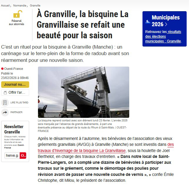 23 février 2026 Fin de carénage : remise à l’eau le 22 février 2026 Article Ouest France 23 février 2026 Consultez l’article en ligne :https://www.ouest-france.fr/normandie/granville-50400/a-granville-la-bisquine-la-granvillaise-se-refait-une-beaute-pour-la-saison-9f2ecf9e-0779-11f1-ac98-9d96616aa65e