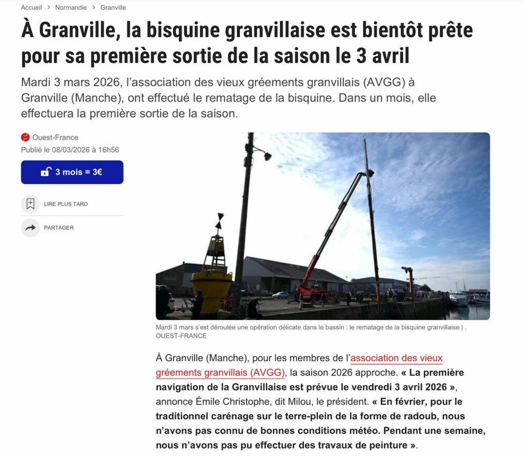 9 mars 2026 Remâtage de La Granvillaise Article Ouest France du 8 mars 2026 Consultez l’article en ligne :https://www.ouest-france.fr/normandie/granville-50400/a-granville-la-bisquine-granvillaise-est-bientot-prete-pour-sa-premiere-sortie-de-la-saison-le-3-avril-b507f892-1af5-11f1-94ce-5f7ed2d3bca0